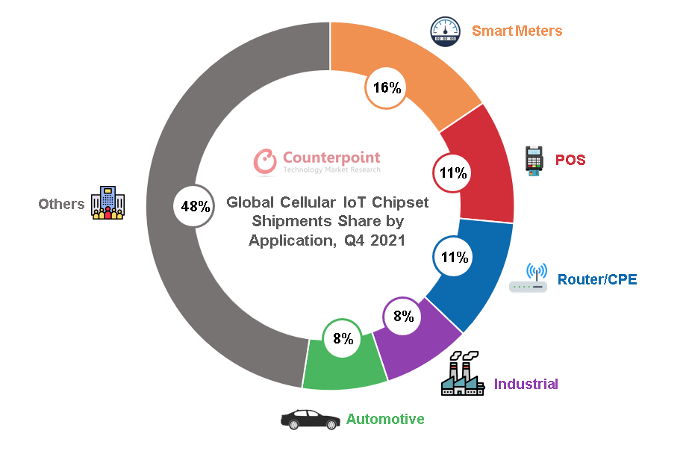 在蜂窩物聯(lián)網(wǎng)芯片中,當前應用規(guī)模最大的是低速率的NB-IoT芯片(占比60%),NB-IoT也是我國主推的物聯(lián)網(wǎng)連接方式,應用在智能儀器表盤、資產(chǎn)追蹤等場景。其次是中速率的2G/3G(占比30%),用于移動支付、智能穿戴和智能家居中。4G Cat.1和5G大約占比10%, 5G模組的成本過高,加上大部分物聯(lián)網(wǎng)終端對傳輸速率的需求性不高,5G在物聯(lián)網(wǎng)終端的應用占比較低,主要是自動駕駛和視頻監(jiān)控領域,但隨著2G/3G轉(zhuǎn)網(wǎng),Cat.1在智能支付、定位追蹤、車載終端、視頻監(jiān)控領域的高速增長,正逐漸打破蜂窩物聯(lián)網(wǎng)6:3:1的格局。從應用場景來看,智能表計、POS支付、路由器/CPE、工業(yè)、汽車是蜂窩物聯(lián)網(wǎng)芯片應用最廣泛的前五大場景。